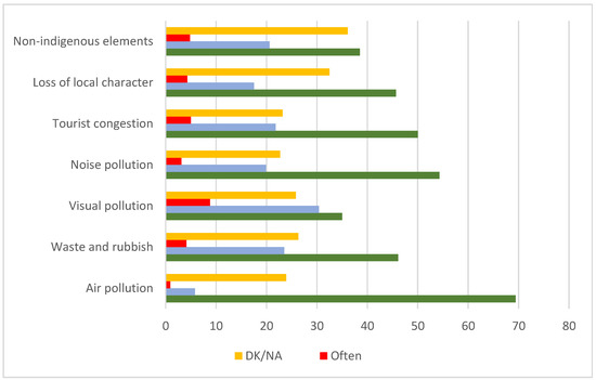 Another aspect to be noted is the quality of the environment visited, which determines sensory stimuli (key requirements in developing a tourist product). The assessment of the parameters affecting the quality of the landscape allows us to identify some of the threats it faces. When asked about the conservation of the environment, the visitors replied positively, especially regarding pollution and noise (70% and 54% of the respondents had not perceived these problems, respectively). The number of visitors and the distances between attractions means the area does not suffer, or only occasionally suffers, problems of congestion (50% perceived no excess of visitors, although 22% reported having suffered congestion on occasions). Visual pollution in the form of aerials, power lines and quarries appears to be a bigger problem (30% of visitors had perceived such pollution occasionally and 9% considered it a common problem). Land pollution due to uncontrolled dumping (rubbish, livestock waste, etc.) was significant for 24% of visitors, although 46% had never noticed it. Visitors also noted aspects that might make the landscape lose its identity or authenticity, such as the disappearance of traditional elements or the appearance of imported ones. However, they recognized having insufficient knowledge of the problem, which means the percentage of blank answers was high (36%) (Figure 3).