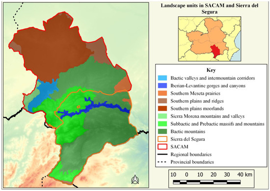 The two districts extend to the west and south of the province of Albacete and cover a significant part of its surface area (42%). However, there is a notable contrast between their spatial and populational importance, given that they only account for 10% of the total population of the province (Table 2). The Sierra de Alcaraz and Campo de Montiel comprises 25 municipalities (which together make up about a quarter of the province). The Sierra de Segura is a less extensive territory formed by 12 municipalities, covering about 18% of the whole area of the province. Different units can be identified, forming a mosaic with a certain diversity of geomorphology and landscape [69]. As regards physical characteristics, the two areas are home to the three types of natural units existing in the region, namely mountains, plains and foothills. These districts extend from the Baetic mountains of the Sierras de Segura and Alcaraz, through the areas of Paleozoic basement in the foothills of Sierra Morena, to the plateau of Campo de Montiel and the transition to the plains of La Mancha (towards the north and east) (Figure 4).