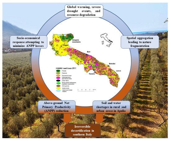 A robust and consistent picture of climate change over the Mediterranean has emerged, consisting of both a pronounced decrease in precipitation, especially in the summer season, and a temperature increase, with its maximum in the summer leading to an increased frequency of high-temperature events [30,31]. The main landscape changes responsible for land desertification are given by the merging of arable lands [32], a contraction of vineyards, and the expansion of olive groves, plantations, and urban areas, with large increases in energy use, water consumption, and fertilizer applications, leading to extensive biodiversity loss (Figure 1) [33]. As a result, the main vulnerability of the region relates to its persistent water scarcity and its water budget deficit (about 350 mm/year), requiring regular water imports from nearby regions and forcing the exploitation of aquifers [34,35].