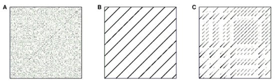Recurrence plots of three prototypical systems: (A) uniformly distributed white noise, (B) fully predictable oscillating motion with sine frequency, and (C) irregular and unpredictable chaotic system [14].