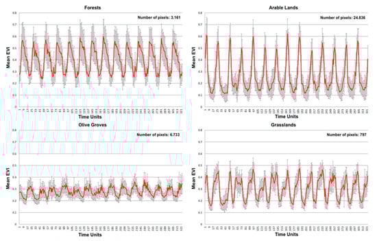 Mean EVI time series of the Apulia region provide a picture of land cover types fluctuating around some trends (increasing or decreasing) or stable average, but with clear differences in the regularities of periodicities and amplitudes of the processes (Figure 3). Broadleaf Forests present the highest average EVI with clear periodicities, with a maximum EVI in late spring (May) and a minimum in winter (February). In contrast, Olive Groves show irregular periodicities with lower amplitude, with a maximum EVI in winter (January) and a minimum in summer (July). Arable Lands show periodicities that clearly reflect the cycle of agricultural practices such as sowing, irrigation and growing, and harvesting, with a maximum EVI in spring (April) and a minimum in July. Grasslands, including semi-arid grasslands, garigues, steppes and pastures, show irregular periodicities with higher amplitude than Olive Groves but with a similar average EVI, with reduced photosynthetic activity in the summer.