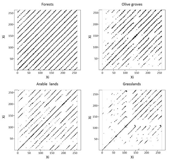 In this research, RP-RQA was performed on the average time series of the four main types of land cover (Forests, Olive Groves, Arable Lands, Grasslands) representing 94.2% of the entire Apulia region, with a sampling time of 16 days over fourteen years (2000–2014). The recurrence is the time it takes for the trajectory of an EVI series to return to its original state.