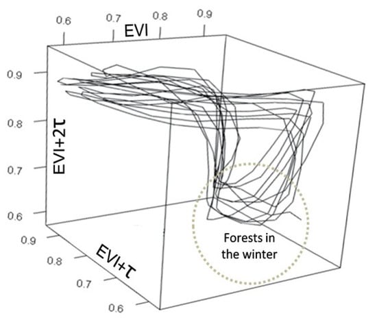 The three-dimensional reconstruction of the EVI time delays in the phase space for Forests shows that the trajectories remained approximately in the same phase space in fourteen years, exhibiting the greatest stability and predictability with a minimum EVI in winter (Figure 6). Such a three-dimensional reconstruction supports the existence of much less temporal variation in CO2 fluxes than commonly assumed for trees subjected to periodic photosynthetic down-regulation [62].
