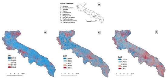 (A) The Atlas of the eleven main large landscapes characterizing Apulia Region, and the maps of the main recurrence variables (B) Divergence, (C) Determinism, (D) Laminarity.