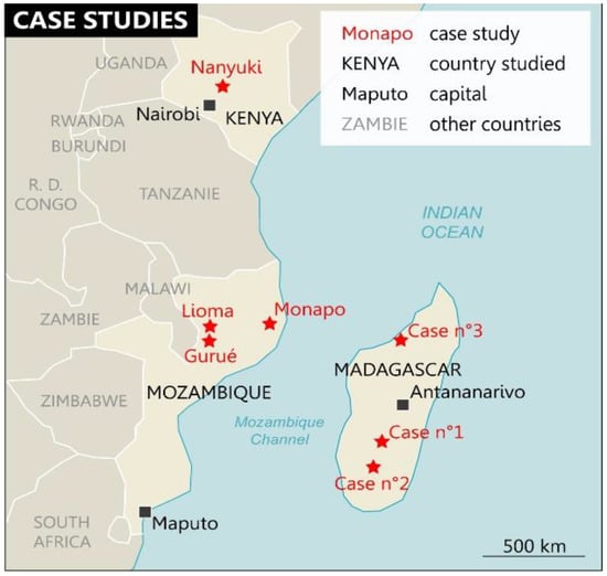 The AFGROLAND project selected the three countries (Kenya, Madagascar and Mozambique for two reasons. The main reason was these three countries were among the top destination of LSAIs in Africa and available studies on the impact of land acquisition on households food security in Kenya, Madagascar and Mozambique have mainly used descriptive analysis and single measures of food security compared to other targeted African countries such as Ethiopia. In each country, LSAI projects were purposively selected in the Nanyuki area from Kenya; Satrokala and Ambatofinandrahana from Madagascar and the Nacala Corridor of Mozambique (Monapo and Gurué districts) as shown in the figure below (Figure 1) [,,]. The AFGROLAND project team selected these cases for the following reasons: (1) the level of development of the companies (most of the companies were 10–20 years old); (2) the area cultivated (i.e., greater than 200 ha, only two LSAI companies in Kenya were less than 200 ha); (3) the number of households potentially affected (through contracts, jobs or land losses); and (4) the willingness of the large company to work with the researchers.