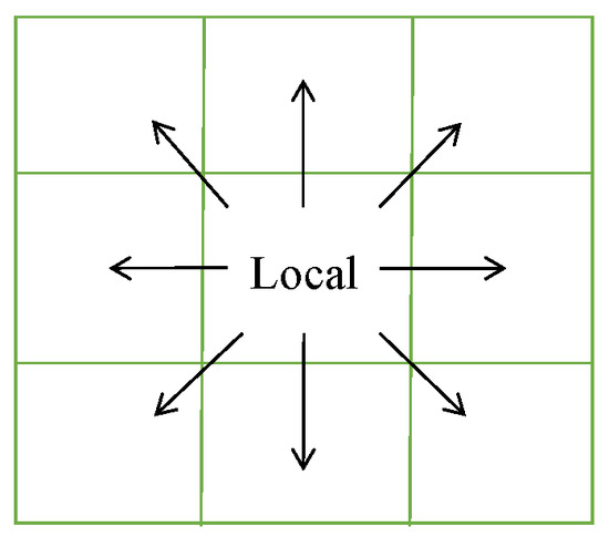 First order adjacency matrix is a type of adjacency matrix, which mainly reflects the relationship between the local area and surrounding areas, that is, there is a common vertex or boundary between the two regions (Figure 2). The matrix limits the effective range of spillover effect and emphasizes that only the queen contiguity regions have obvious spillover effect. For example, the effective range of knowledge spillover effect is within 300 km (generally beyond the scope of a province in China) [39]. The expression of the first-order adjacency matrix is as follows: