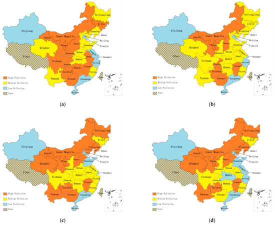 Figure 3 shows that the regions of medium and low industrial pollution are mostly the more economically developed regions, and there is a clear distribution characteristic—the eastern coastal region have less industrial pollution, while some parts of central and western China have more. However, over time, the eastern region solidified its low industrial pollution levels, while the central region generally maintained medium industrial pollution levels and northern China clearly behaved in a high industrial pollution trend.