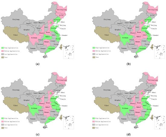 Innovation agglomeration distribution. (a) Innovation agglomeration in 2006. (b) InnovaTable 2010. (c) Innovation agglomeration in 2014. (d) Innovation agglomeration in 2018.