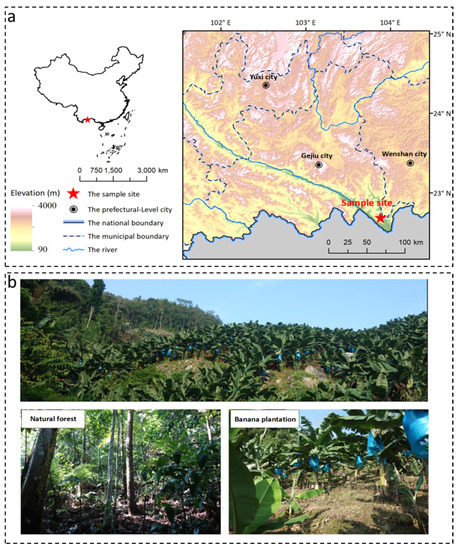 The studied sample sites were located in Gulinqing Nature Reserve, Maguan County, Southeastern Yunnan Province, China (103°54′ E, 22°43′ N) (Figure 1). This region is characterized by a typical subtropical monsoon climate. The annual average temperature is between 18.2 and 22.2 °C, and the annual average precipitation is 1700 mm, which mainly occurs from May to October. The main tree species of the natural forest are Dipterocarpus tonkinensis, Pometia tomentosa, Altingia yunnanensis, Shorea chinensis var. kwangsiensis, Burretiodendron hsienmu, Castanopsis fabri, Caryota urens, Lithocarpus truncatus, Fagus longipetiolata, Alnus nepalensis, Cunninghamia lanceolata, Dendrocalamus strictus, and Arenga pinnata. Four banana plantations with 3-, 7-, 10-, and 22-year cultivation ages were chosen, all of which were converted from natural forests. The slope (approximately 8°) and altitude (approximately 450–650 m) were relatively consistent between the natural forest and the four banana plantations. Approximately 2400 bananas ha−1 were planted, and commercial organic fertilizer was applied at a rate of 36,000 kg ha−1 y−1 as the base fertilizer. Inorganic fertilizers were applied five to six times each year in a circular trench approximately 20 cm away from the banana plants. According to the field investigation, these plantations were fertilized with approximately 320–380, 220–240, and 150–530 kg ha−1 y−1 of N, phosphorus (P), and potassium (K), respectively. The organic fertilizer contained 3.1 g N kg−1, 3.0 g P kg−1, and 2.1 g K kg−1. The soil of this area is a mixed soil deriving from carbonate rock and basalt weathering, and is classified as Latosol (US Soil Taxonomy), containing 18.5% clay, 65.6% sand, and 15.9% silt.