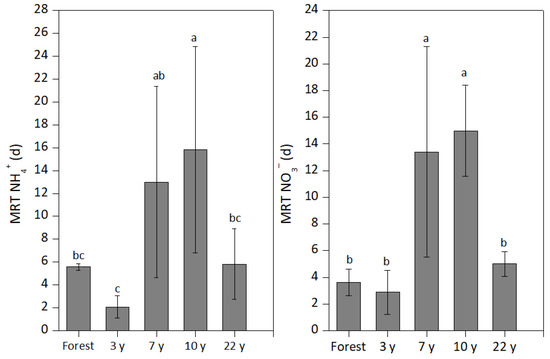 The mean residence times of NH4+ (MRT NH4+) and NO3− (MRT NO3−), expressed as d, were calculated following the equation of Corre et al. (2007) [42].