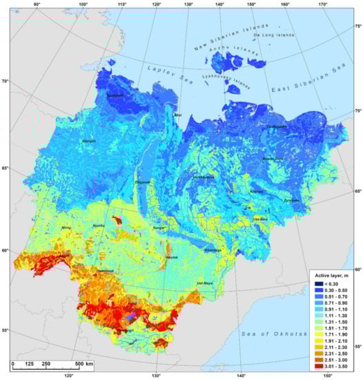 The active layer thickness map is in good agreement with the landscape’s distributions. The map demonstrates intrazonal differences depending on the geological–geomorphological and soil–plant features. The active layer thickness is a characteristic of permafrost, which is rather difficult to map due to its multifactorial nature. We relied on research in the mapping methodology of Vasiliev [,], which depends on the landscape method. Its maps show the leading factors in forming active layer thickness—landscape–climatic zones on the plains and in mountainous regions, and geological–genetic complexes with characteristic soils and vegetation associations. The tabular legend gives the values of the active layer thickness. However, we decided to show the numerical distribution of the active layer thickness in Yakutia, varying from less than 0.3 to 3.5 m. The values of the active layer thickness on the map given for undisturbed landscapes of Yakutia. This map, and the ground temperature map, can serve as a basis for assessing the transformation and degradation of permafrost during climate warming and anthropogenic disturbances.