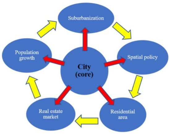 The introduction of ground rents and property rights as a result of political and economic transformations also triggered suburbanization processes in Poland [52,53,54,55], and real estate purchases in suburban areas increased due to growing affluence. The growth of real estate markets in suburban areas accelerated after the political transformations of 1989 [56,57], especially around big cities [58,59,60]. Since 1990, spatial planning policies and progressing suburbanization have led to significant changes in land-use structure (increase in residential area), infrastructure development, population and the number of transactions involving residential property. The type and scope of these changes have varied intensity and territorial scope, and they are largely determined by an urban area’s status in the hierarchy of cities. The migration of the urban population to suburbia proceeded most rapidly in the largest cities, followed by medium-sized towns.
