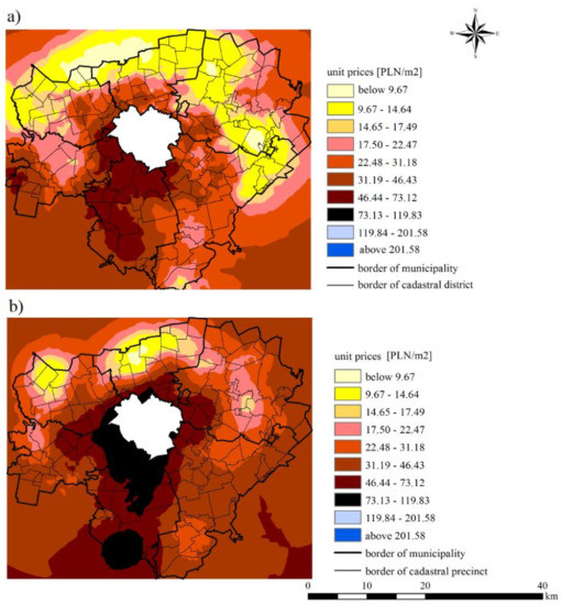 The distribution of the unit prices of construction plots was also analyzed to determine the spatial pattern of real estate transactions on the local market. This is an important consideration because the choice of location is linked with prices, and prices influence decision-making [84]. The spatial distribution of the unit prices of construction plots was interpolated (Figure 5a,b) to identify trends in the development of the suburban zone and prime locations (based on prices).
