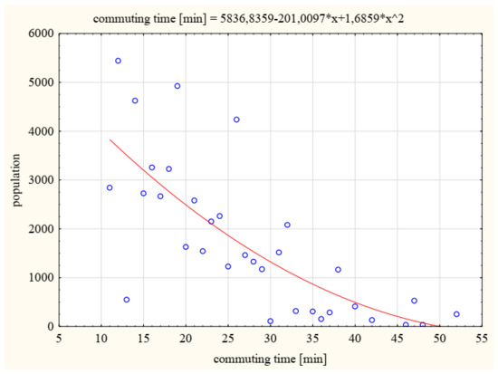 The choices made by real estate buyers influence land use. New residential areas are created, which leads to changes in population [85]. Temporal accessibility induces demographic changes, and differences in commuting time influence population density. In the studied area, changes in population were strongly linked with access to transport infrastructure. As demonstrated in Figure 6, population decreased with an increase in commuting time. More people settle in areas with better accessibility.