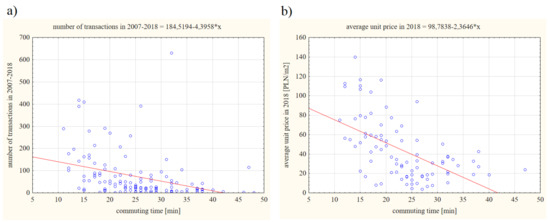 Correlations between (a) commuting time and the number of transactions, (b) commuting time and average unit prices. Source: own elaboration.