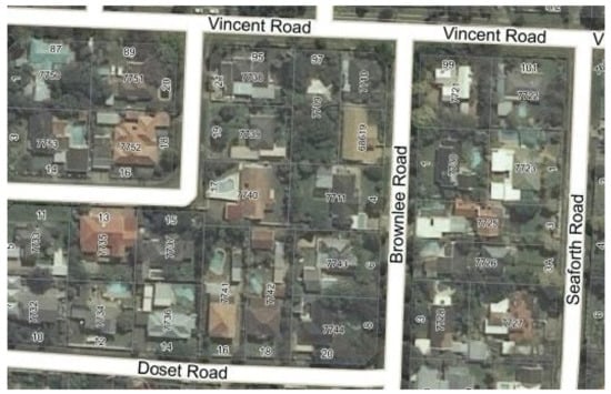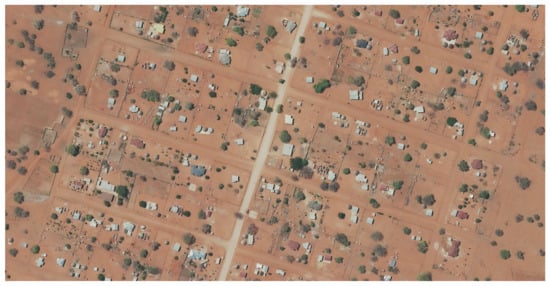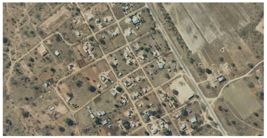 Strides must be made to replace antiquated systems and equipment with their highly efficient modern successors. NGI, as the South African National Mapping Agency, has extensive aerial photography coverage of the whole country []. The denser the population, the larger the scale of the photography and more frequently updates are undertaken. Much of this aerial photography has been adjusted into rectified imagery at an accuracy better than most of the spatial data recorded in the Offices of the Surveyors-General. As can be seen from the recent rectified imagery of which extracts are recorded in Figure 1, Figure 2 and Figure 8, Figure 9, Figure 10 and Figure 11 (Figures S1, S2 and S4–S7 [] in the Supplementary Materials), many of the unregistered land occupations are defined by fences, hedges or walls. Therefore, the country has usable rectified imagery from which all visible boundaries can be determined.