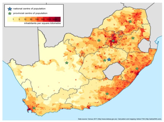 - Frith, A. Centres of Population of South Africa. Available online: https://adrian.frith.dev/images/mean-centres-150dpi.png (accessed on 2 March 2021).