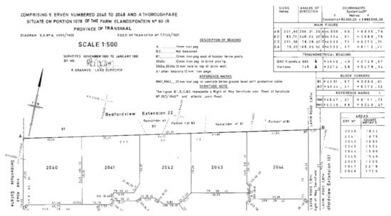 Over the years, all existing deeds (to the exclusion of most other land rights), issued under any administration, have been incorporated into the current deeds registration system, which is now governed by the Deeds Registries Act []. This deeds registration system is dependent on the preparation of diagrams that detail the dimensions, area and position of approximately nine million land parcels, with the support of figures delineating the shape in a prescribed format [,] (vide Figure S6 [] in the Supplementary Materials and extract in Figure 6).