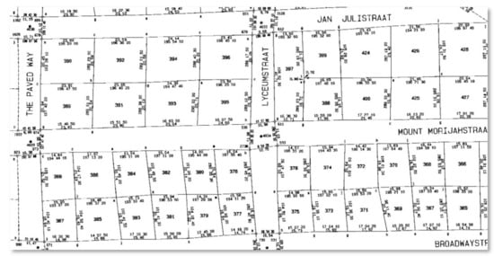 Another matter to consider is that, during the 1980s, the state issued contracts to land surveyors to document many of the previously un-surveyed dormitory townships that had been laid out some distance away from the formal “white” towns, primarily as accommodation for African labour who worked in the nearby towns. A few hundred land surveyors surveyed hundreds of thousands of land parcels in a very short time and completed the project well ahead of the anticipated schedule. The townships had been laid out, houses built, and yards fenced. In most instances, land surveyors were able to survey the fence corner posts, i.e., boundaries were defined by physical features approximating rectangular sites and blocks as originally demarcated. Figure 12 is an extract of a survey in which the author was involved (Figure S12 [] in the Supplementary Materials).