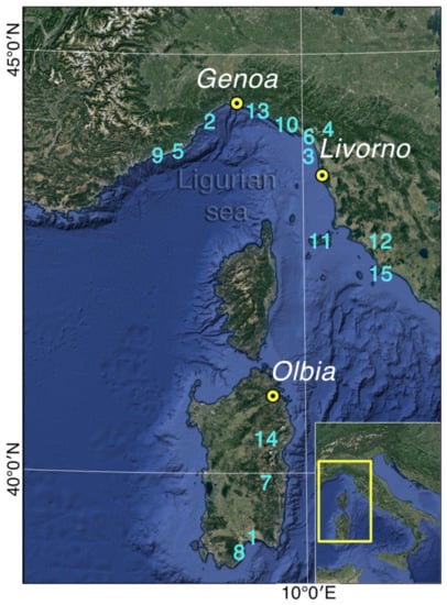 Geographic location of the case-studies: Genoa Sestri Ponente (Liguria), Livorno (Tuscany) and Olbia (Sassari, Sardinia). Other places named in the text: (1) Cagliari; (2) Savona; (3) Versilia; (4) Garfagnana; (5) Imperia; (6) Massa and Carrara; (7) Villanova Strisaili; (8) Capoterra; (9) Bordighera, Vallecrosia, Ventimiglia; (10) Cinque Terre; (11) Elba Island; (12) Grosseto, Maremma; (13) Recco, Camogli, Chiavari; (14) Bitti; (15) Orbetello.