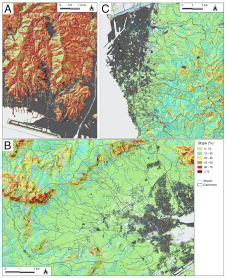 Slope maps and catchments of the case-studies: Genoa Sestri Ponente (A), Olbia (B) and Livorno (C).