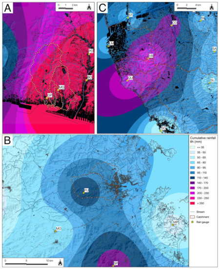 Cumulative rainfall map for a time period of 6 h: (A) Genova Sestri Ponente, 4 October 2010; (B) Olbia, 18 November 2013; (C) Livorno, 9 September 2017. Rain gauge stations: (GP) Genova Pegli; (MG) Monte Gazzo; (PO) Pontedecimo; (BO) Bolzaneto; (LM) Livorno Mareografo; (ST) Stagno; (QU) Quercianella; (VB) Valle Benedetta; (CO) Collesalvetti; (SI) Siberia; (SA) Santermo; (SL) Santa Luce; (SO) Solvay; (PU) Putzolu; (MO) Monti; (MP) Monte Petrosu; (SP) Sa Pianedda.
