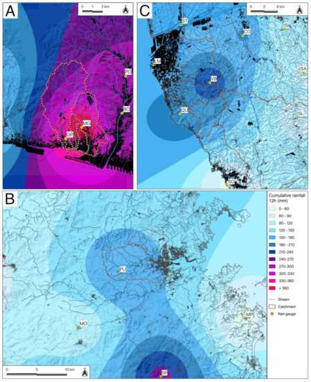 Cumulative rainfall map for a time period of 12 h: (A) Genova Sestri Ponente, 4 October 2010; (B) Olbia, 18 November 2013; (C) Livorno, 9 September 2017. Rain gauge stations: (GP) Genova Pegli; (MG) Monte Gazzo; (PO) Pontedecimo; (BO) Bolzaneto; (LM) Livorno Mareografo; (ST) Stagno; (QU) Quercianella; (VB) Valle Benedetta; (CO) Collesalvetti; (SI) Siberia; (SA) Santermo; (SL) Santa Luce; (SO) Solvay; (PU) Putzolu; (MO) Monti; (MP) Monte Petrosu; (SP) Sa Pianedda.