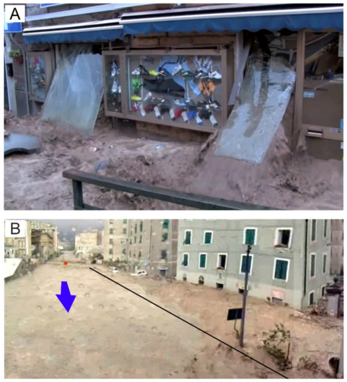 (A) Chiaravagna Stream flooded the ground floors, where there are many business shops and in some cases the water and mud depending on the preferential outlet flow found that entered the shops from the rear part, as can be seen in a sports shop in the Aprosio Square [56]. (B) Image taken from a movie. Chiaravagna Stream during the paroxistic phase of flooding: the black line indicates the submerged left bank wall; the red asterisk represents the bridge of Chiaravagna Street. The building from which the photograph was taken was built just on the riverbed in the 1960s. The October 2010 event (the last one of a long list) was recognized as one of the causes of the flooding of the river: it was demolished a few years later [56]).
