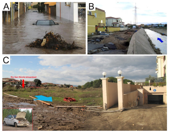 With respect to the 2013 event, the area affected by the event was estimated at around 1500 km2 and includes three main basins: the Cedrino and Posada basins and the catchment upstream of Olbia [53]. The city of Olbia was the most affected city, with eleven victims; much of the downtown area was inundated by the flood waters of the San Nicola and Seligheddu streams in the mouth area. Witnesses claim to have seen the hydrometric levels increase by about 3 m and this would be confirmed by the simulations carried out by [54] and associated with flow velocities higher than 3.2 m/s in the upstream sectors along the hydrographic lines. The railway embankment and the various bridges upon the arrival of the flood wave along the aforementioned canals had a dam effect and caused the flooding of the streets and the first floors of the houses. The most acute phase of the flood event was observed between 5:00 p.m. and 7:00 p.m., with more evident manifestations at around 6:00 p.m. on the Rio Seligheddu Stream and at around 6:30 p.m. on the urbanized stretch of Rio Gadduresu Stream which is its left tributary. Around 9:00 p.m. the flood had subsided with evident manifestations in the sectors surrounding the watercourses of Seligheddu, San Nicola, Zozò, Paule Longa and to a lesser extent the Pasana. In some sectors (former Artillery area), with variable tie rods up to about 2 m, the effects of the flood of Rio Gadduresu Stream from the north and east overlapped with those of Rio Seligheddu Stream from the south, which is a condition favored by the existing artifacts which represented temporary structures that are damming to the outflow of flood waters (Figure 9A–C) [55].