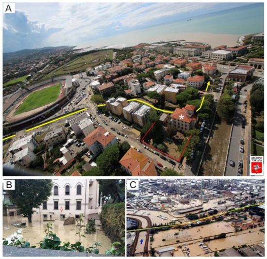 Livorno. (A) aerial photograph of the Ardenza Stadium district. In the foreground isthe house where the four victims drowned (white asterisk). The yellow line highlights the culverted streambed of the Rio Maggiore: its flood waters were the cause of the rapid flooding of the courtyard (evidenced by red lines) and of the ground-floor flat [58]. (B) Livorno: the house where four people from the same family drowned (courtesy of Il Tirreno). Their ground-floor flat is located at the end of a large courtyard, below street level on Rodocanacchi Street (area of the Ardenza football stadium). The red arrow indicates the level reached by the floodwaters in a few minutes. (C) Livorno: the Stagno district that was largely flooded by the Rio Ugione floodwaters with the Via Aurelia (yellow line) and the refineries in the background [58].