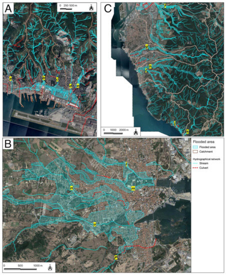 The case studies examined are characterized by a similar geomorphological structure and recent evolution, which has profoundly changed almost all Mediterranean urban areas [22,29]. Sestri Ponente, Olbia and Livorno are in fact three cities built on a coastal floodplain at the mouth of small hydrographic basins (Figure 11A–C).