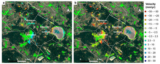 A-DInSAR Displacement velocity maps of the Legnica Glogow Copper mining District (LGCD) for the time period October 2014–April 2019; (a) horizontal displacement velocity map, along the east-west direction; green color represents stable areas, cyan, and blue colors represent the displacement towards the east, while orange and red colors represent the displacement towards the west; (b) vertical displacement velocity map, along the up-down direction; green color represents stable areas, orange, and red colors represent subsidence.