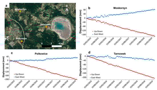 Time series of displacement for 3 areas selected as examples in the LGCD district; (a) location of the PSs selected for processing the time series; (b–d) time series at Moskorzyn, Polkowice, and Tarnowek towns, respectively; the time series were retrieved averaging the time series for 3 neighboring PSs.