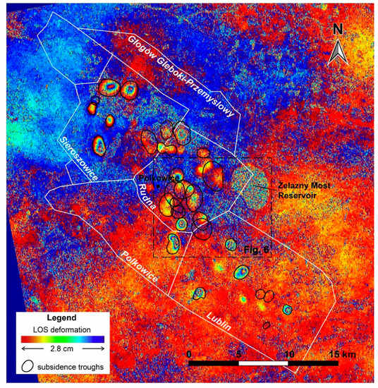 In the LGCD region, 30 different ellipsoidal fringes covering relatively small areas indicate troughs of subsidence, which in some cases took place several times in the same area during the analyzed time span. The location of these active subsidence areas within the perimeter of the mines suggests a direct connection between the mining activity and the superficial deformation phenomena (Figure 5 and Figure 7). This hypothesis is supported by a previous work of Popiolek et al. [61] that carried out a pioneering application of the InSAR technique for the monitoring of LGCD areas using a single interferogram processed from two ERS-1 images of January and March 1994. These authors argued that the origin of the 26 detected subsidence troughs was directly connected with the mine exploitation by comparing the analysis of the interferogram and the mining exploitation development for the analyzed time.