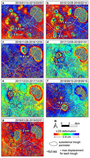 On the other hand, some deformation zones show a discontinuous pattern over time, and in several cases, they disappear suddenly in subsequent interferograms or do not maintain the same intensity of subsidence, showing relatively intermittent or impulsive behavior. For example, in Figure 6g, a subsidence trough shows four fringes in the interferogram that spans from 26 January 2019 to 2 February 2019, which roughly correspond to about 11.2 cm of displacement in 6 days, but fringes were totally lacking in several previous interferograms (Figure 6c,e,f).