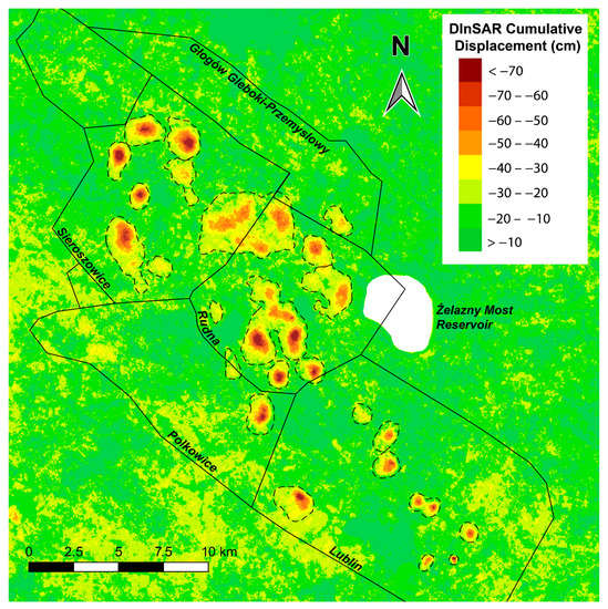 DInSAR cumulative displacement at the LGCD mines, from October 2014 to April 2019; black lines represent LGCD mine district borders; dashed black lines represent the perimeters of the areas subject to a subsidence >30 cm.