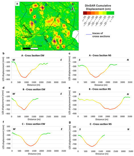 Cumulative displacement profiles at three subsidence troughs A, B, and C; (a) location of the cross sections; (b,c) EW and NS cross sections of subsidence trough A, respectively; (d,e) EW and NS cross sections of subsidence trough B, respectively; (f,g) EW and NS cross sections of subsidence trough C, respectively.