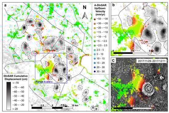 In Figure 9, the complementarity between the two different SAR interferometry techniques (A-DInSAR and DInSAR) is highlighted: colored points represent the PSs in an up-down direction and the black and white image represents the cumulative DInSAR displacement map of Figure 7 in shades of gray. In Figure 9c, it is worth noting that in the areas not covered by PSs, several sub-circular or ellipsoidal fringes occur. This is clear in Figure 9b where a subset of interferogram near Polkowice is shown: where the PSs are lacking, the interferogram shows ellipsoidal fringes, which correspond to the areas with the highest displacement rate. This residual subsidence located around the areas affected by intense deformation is well mapped by PSs distribution and decreases gradually by up to 1.5 mm/year (considered as a stability threshold) about 1.5 km away from the center of the subsidence troughs.