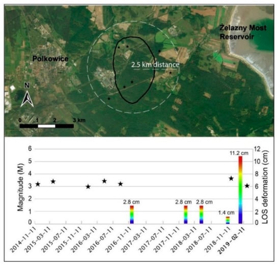 To examine a possible cause-effect relationship between tremors and subsidence pattern detected at LGCD, the space-time coincidence between earthquakes and subsidence events was investigated. As described by some authors (e.g., [26]), the onset of intense subsidence would occur immediately after the tremor, or after a maximum of one day. Figure 10 shows the distribution of epicenters of seismic events with M > 3 which occurred from October 2014 to April 2019, and the locations of the subsidence troughs detected by DInSAR that were classified according to their deformation behavior: impulsive or continuous over time. Although Figure 10 shows that several epicenters are located in correspondence with the subsidence troughs, in most cases the dates of tremors and subsidence events (fringes) did not match. The lack of time coincidence is highlighted in the example shown in Figure 11, which represents the location of a subsidence trough between Polkowice town and the Żelazny Most reservoir, where the cause-effect relationship between tremors and deformation pulses was not verified. The graph shows (i) the dates of 5 deformation pulses (quantified in LOS displacement in the histogram bars) which took place in this area and represented in 5 different interferograms and (ii) the dates of the major seismic events (black stars) that occurred within a radius of 2.5 km from this subsidence area. Deformations do not occur concurrently with earthquakes, and a proxy of the direct cause and effect relationship is lacking.