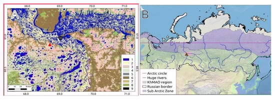 Map of the study region. Location of the Mukhrino field station. (A): On the local scale (1—water, 2—floodplain, 3—ridge-hollow bog, 4—ryam bog, 5—pine forest, 6—mixed forest, 7—deciduous forest, 8—burnt and disturbed forest, 9—infrastructure). (B): On the Russian Federation scale.