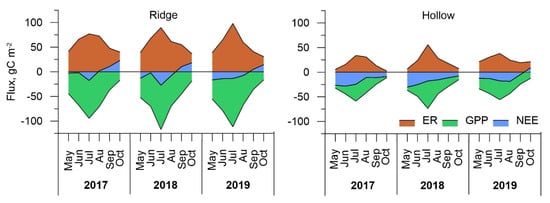 - Dyukarev, E.; Godovnikov, E.; Karpov, D.; Kurakov, S.; Lapshina, E.; Filippov, I.; Filippova, N.; Zarov, E. Net ecosystem exchange, gross primary production and ecosystem respiration in ridge-hollow complex at Mukhrino bog. Geogr. Environ. Sustain. 2019, 12, 227–244. [Google Scholar] [CrossRef]