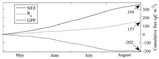 The automated system operated in a measuring mode from July to August in 2017, and from May to October in 2018 and 2019. The CO2 flux was calculated using a specialized software module developed in the Matlab R2014b (MathWorks, Natick, MA, USA) using a linear model for changing the concentrations in the chambers during the first two minutes of data sampling. To obtain continuous data records, to extrapolate them to other periods when experimental data are missing, and to calculate the annual carbon budget of the ecosystem, a model of total ecosystem carbon exchange was used [46]. The measured total NEE was partitioned into gross primary production (GPP) and total ecosystem respiration (ER) components. The model was calibrated using all available data sets on carbon dioxide fluxes in 2017–2019 [47] and extrapolated for the period 2010–2016.