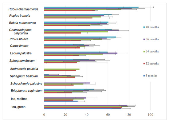 To estimate the conditions of organic matter decomposition dynamics in different ecosystem types at the Mukhrino FS, a series of experiments was launched in 2016. Occasional studies on the decomposition of peat and Sphagnum spp. were performed earlier by [51,54]. The classical approach of litter bags was used to estimate weight loss, including standard litter type (tea) and native litters (see Table A3 in Appendix A) under both natural and experimental warming conditions (Open Top Chambers). The standard tea substrate was used to compare habitat effects and supplement the data to global projects on decomposition dynamics [55,56,57].