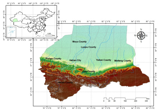 In this paper, the research area refers to the Hetian area, located in the Tarim Basin of Xinjiang, Western China, centered at 79.92° E longitude and 37.12° N latitude. Hetian has jurisdiction over a county-level city and seven counties in total (Figure 1). The topography of the research area is low in the north and high in the south, with basins and oases in the north and mountainous highlands in the south. Hetian includes the Taklamakan Desert, one of the driest deserts in the world. Most lands of Hetian are arid and hyper-arid areas. The aridity index can reflect the degree of drought in a region. In most parts of Hetian, the aridity index is consistently under 0.1, which indicates the severe aridity condition [30]. The main feature of arid and hyper-arid areas is scarce precipitation throughout the year. The average annual rainfall in Hetian is 35 mm, and the annual evaporation is 2480 mm. The sand-dust weather occurs frequently in every season in Hetian, which accounts for more than 220 days each year, of which sandstorm weather accounts for ~60 days. The total land area of Hetian is 24.93 million hectares, of which the mountainous area accounts for 44.5% and the plain area accounts for 55.5%. The mountainous regions consist of 42% bare rock and gravel that are difficult to develop (although there are some grasslands, glaciers, and a small amount of arable and forested land). More than 90% of the plains are desert, while oases, which cover 9730 square kilometers, account for only 3.96% of the total land area. The annual average surface water runoff in Hetian is 7335 million cubic meters. The glaciers in the high mountainous region in the south are the source of inland rivers in the south of the Tarim Basin and are important supply sources for the main rivers in Hetian. At the end of 2018, the total registered population of the entire area was 2.53 million; the urban population was 548,600, and the rural population was 1.98 million. In 2018, the whole region achieved a gross domestic product (GDP) of CNY 30.56 billion and a per capita GDP of CNY 12,094, which reached a peak value compared to the past few decades [31,32].