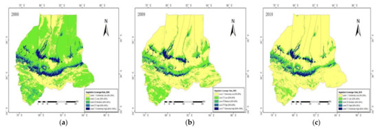 Results of vegetation coverage classification in Hetian: (a) 1995; (b) 2009; (c) 2018.