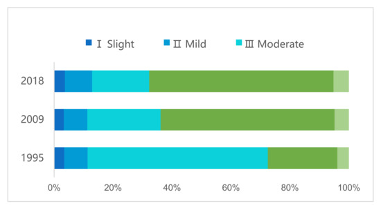 The main external force causing soil erosion in Hetian is wind, and the degree of susceptibility to erosion depends on the slope, vegetation coverage, and land use type. From 1995 to 2018, the degree of change in areas of slight and mild soil erosion in Hetian was very small; however, the area of moderate erosion decreased significantly, from 61.15% to 19.36%, and areas of strong and severe erosion both increased (Figure 4). The land stress index is determined by severe soil erosion area, strong soil erosion area, urban or built-up land area and other soil erosion area. The area of strong erosion changed from 58,779 to 143,798 km2, but the area of other soil erosion declined from 178,735 to 64,877 km2. In addition, the severe soil erosion area, which accounted for the largest weight in the calculation, did not change that significantly. Overall, although the soil erosion area has undergone major changes, the land stress index in Hetian has not changed significantly in the past 25 years, and its value has been stable at ~49 (Table 8).