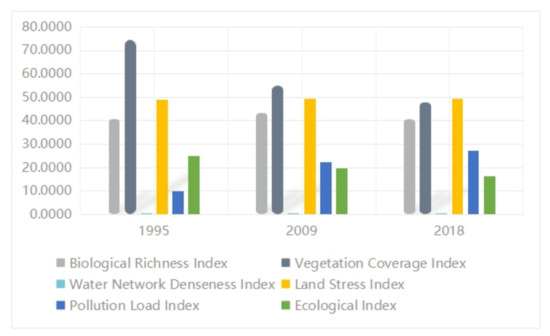 The EI has five sub-indices: biological richness, vegetation coverage, water network denseness, land stress, and pollution load. The first three indices are positively correlated with the eco-environment index, while the last two are negatively correlated. According to Table 10 and Table 11 and Figure 5, the EI of Hetian in 1995 was 24.76, and the eco-environment status was relatively poor. With time, the EI of Hetian continued to decline, reaching 19.52 by 2009, with the eco-environment status dropping to poor. By 2018, the EI in Hetian was only 16.32; this indicates that the quality of the eco-environment in Hetian had declined significantly during the studied period.