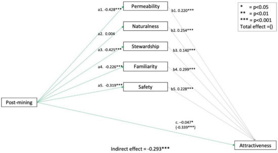 An ordinal logistic model corroborated the original expectation that post-mining forests are much less attractive than the reference commercial spruce timber forest, B = −1.53, OR = 0.21, 95% CI (−1.68, −1.39), z = −21.39, p < 0.001; B denotes the unstandardized regression coefficient and OR denotes the odds ratio in the ordered logit model, CI are 95% confidence intervals for B, z is the test statistic for the test of B and p is p-value for z-test. Model one revealed that post-mining forests were perceived as less attractive than the reference forest and that the lower attractiveness was affected by the observed characteristics; the indirect effect of post-mining was negative (β = −0.293) and statistically significant (p < 0.001); β denotes standardized regression coefficients of a fitted structural equation model and p corresponds to p-values of z-test. After accounting for the indirect effect of the observed characteristics, the effect of the post-mining forest significantly decreased (total effect, β = −0.339, p < 0.001 and the direct effect, β = −0.047, p < 0.05).
