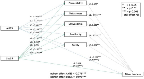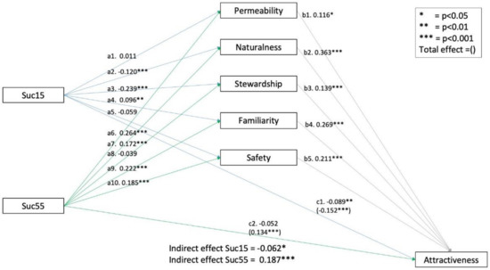 The effect of age, at the growth stages of 15, 35, and 55 years, of the spontaneous successional forest on attractiveness and mediation of the effect by observed characteristics was tested in model 3. The middle-age category Suc35 was held as the reference category. The total negative effect of Suc15 (β = −0.152, p < 0.001) and the total positive effect of Suc55 (β = 0.134, p < 0.001) revealed that the attractiveness of the spontaneous successional forest increased with time. Both positive and statistically significant indirect effects indicated that the improving visual character of the forest mediated the effect of age on the attractiveness of the successional forest (for Suc55, β = 0.187, p < 0.001, for Suc15, β = −0.062, p < 0.05). After accounting for the mediators, both direct effects decreased significantly and the direct effect of Suc55 was no longer statistically significant (β = −0.052, p > 0.05).
