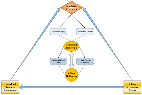 Population hollowing in rural settlements is one of the most significant social issues for many countries. Particularly in recent years, several researchers have identified rural communities as “pioneer” areas given their prior experiences with social changes caused by population hollowing [1]. Different disciplines define rural population hollowing from different perspectives, although two are the most common: sociological and geographical. From the sociological perspective, hollowing refers to the phenomenon of low social and economic development: changes in the organizational structure of rural society and social and cultural life due to the decrease of population, especially young and middle-aged inhabitants; the lack of popularity and vitality in rural society; and the low level of social and economic development [2]. This viewpoint emphasizes the fundamental changes in the structure of rural society caused by population migration. The geographical perspective focuses on the change of spatial form, which emphasizes the spatial form of extensive rural land use and the expansion of inner space caused by population migration [3,4,5].